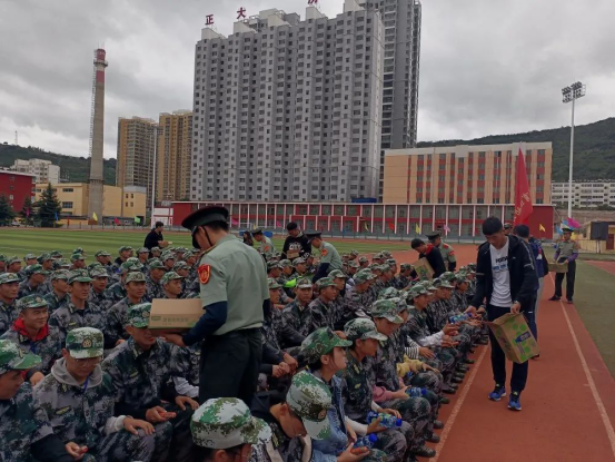 学院领导向军训新生和军训教官发放脉动、火腿肠等物资,为新生带来了节日的亲切问候与祝福。
