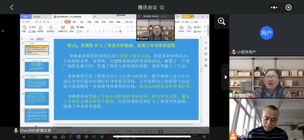 12月19日下午15:00-17:00,首都体育学院原副校长,天水师范学院第四轮重点学科“体育学”首席专家,教授、博士生导师王凯珍应邀为beat365官方网站师生作题为“身体素养视域下的幼儿体育培育发展”的学术报告,会议采用腾讯会议线上方式举行。