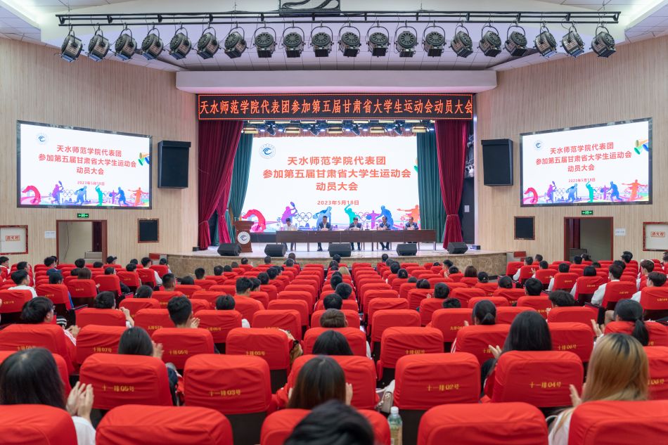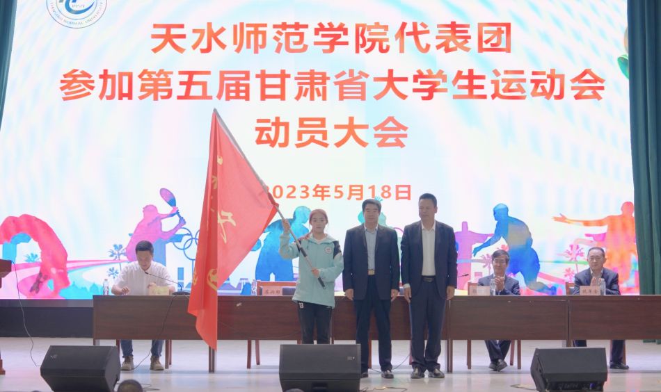 5月18日下午,学校在大礼堂举行天水师范学院代表团参加甘肃省第五届大学生运动会动员大会。校长汪聚应出席作动员讲话并为代表团授旗。