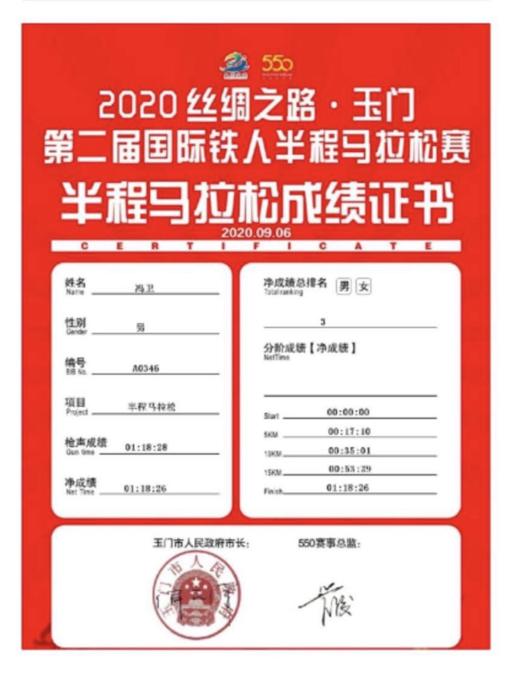 由甘肃省体育局、玉门市人民政府主办,玉门市文体广电和旅游局、玉门市体育中心、玉门市委直属机关工委承办,戈友文化传媒(上海)有限公司运营的2020丝绸之路.玉门第二届国际铁人半程马拉松赛于9月6日在玉门市政广场鸣枪开赛,有来自全国19个省份,60多个城市,共计5000名专业马拉松选手参加本次比赛,beat365运动训练专业2018级冯卫同学,在比赛中不畏强手,最终以1小时18分26秒获得男子组第三名的好成绩,为我校争得了荣誉!