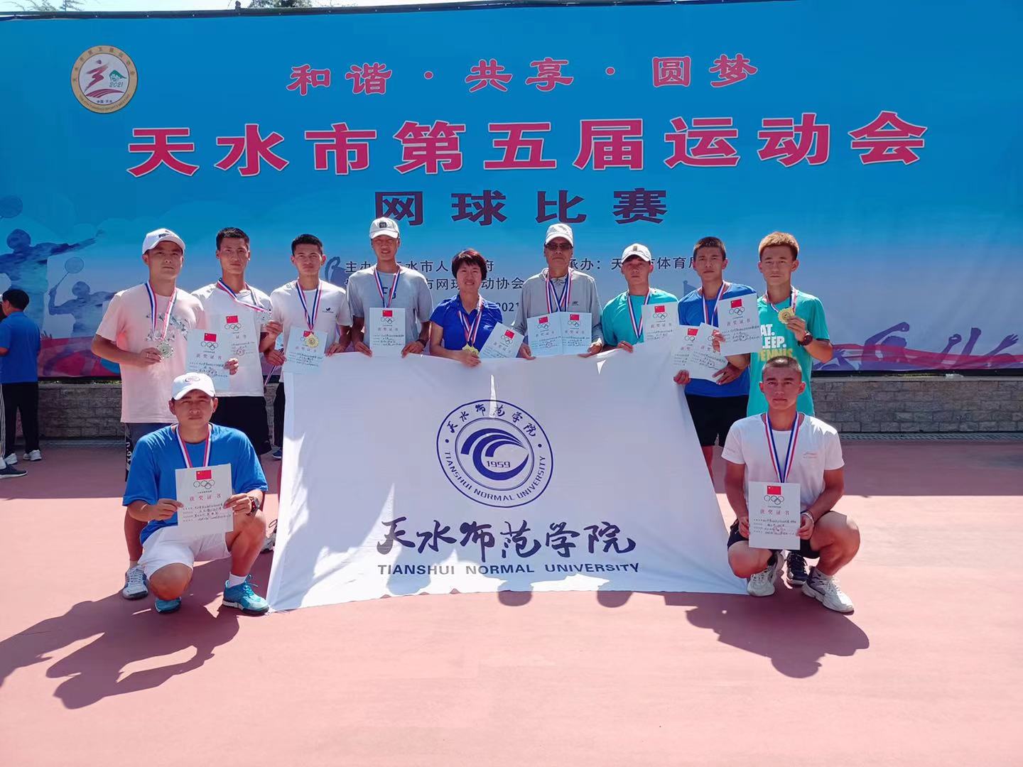 由天水市政府主办、天水市体育局承办、天水市网球运动协会协办的天水市第五届运动会网球比赛,于2021年6月26日至27日在美丽的藉河风情线网球场成功举办。本届比赛历时2天,共有来自兰州电力局、甘肃农大、麦积区、天水一中、市网球协会及天水师范学院6个代表队的100多名运动员参赛。参赛单位及运动员人数均为历届市运会网球比赛之最。