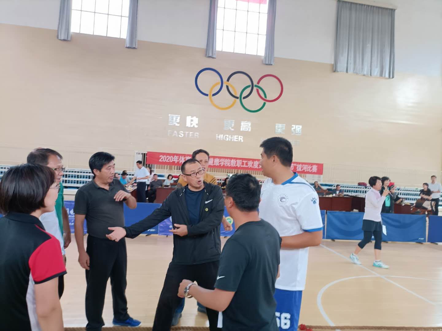 哨声响起,比赛开始,随着“一二,一二”的口号,队员们齐心协力、奋力拼搏,拼命向自己的方向拉绳,激烈角逐着一场场激动人心的比赛,其他教师也自发的组成拉拉队为自己的队员加油助威。一刹那,体育馆中队员们的发力吼叫声和拉拉队加油的呐喊声此起彼伏,比赛精彩纷呈,瞬间点燃了体育馆的氛围。